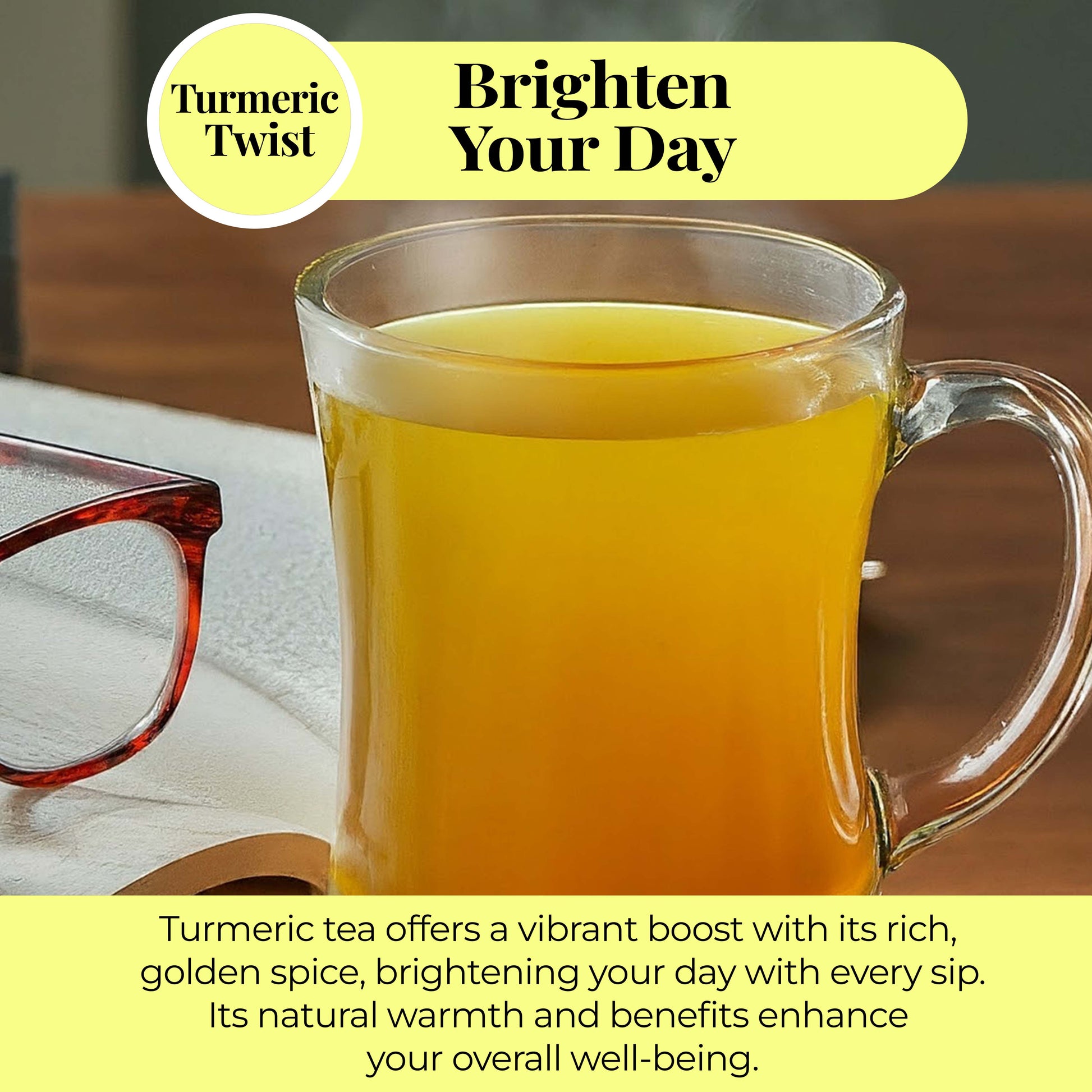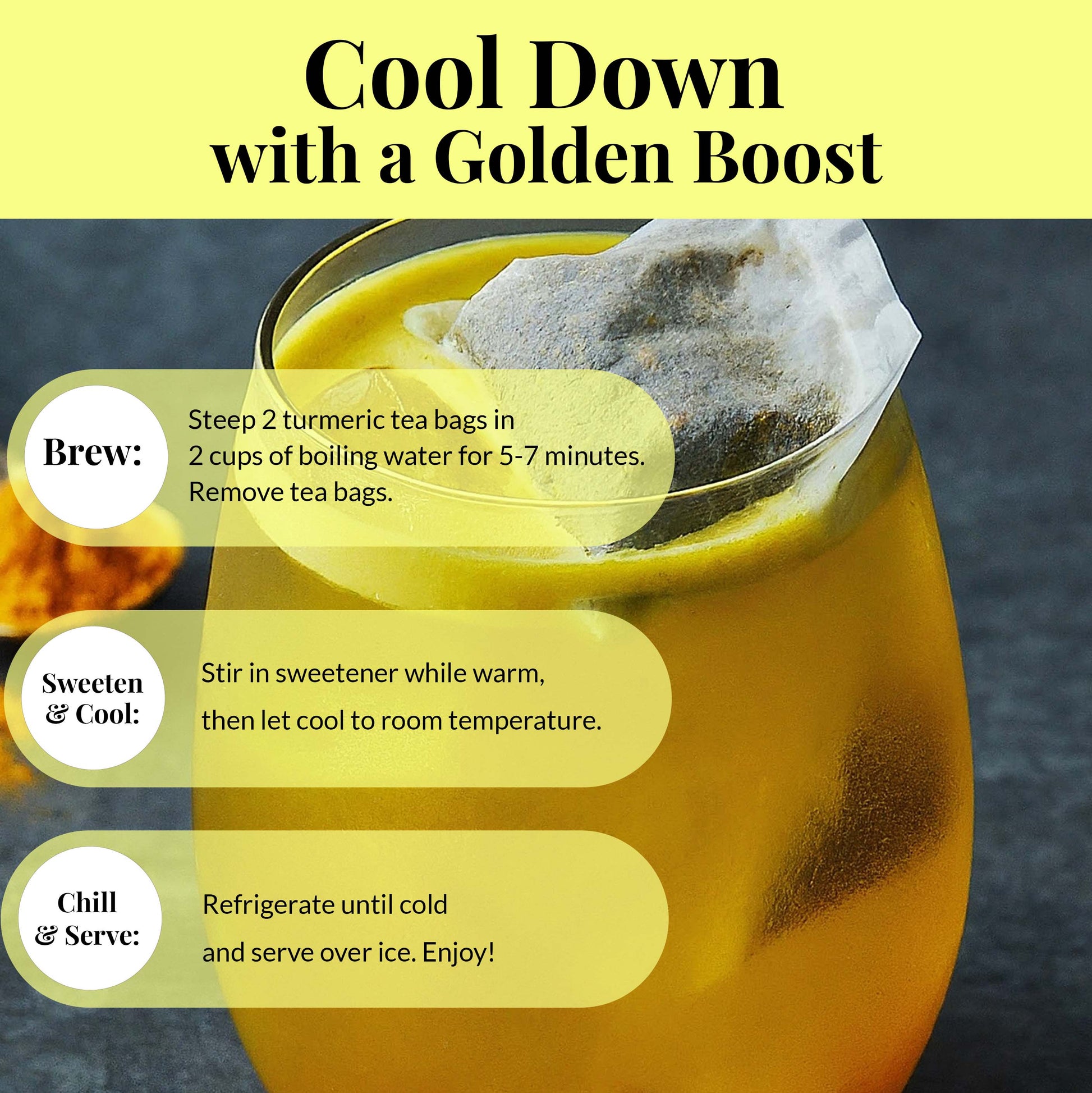 1. Steep 1 turmeric tea bag in 200ml hot water for 5-7 minutes.